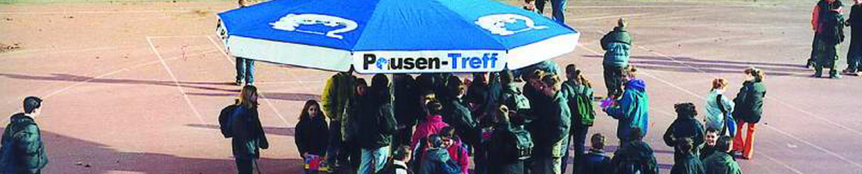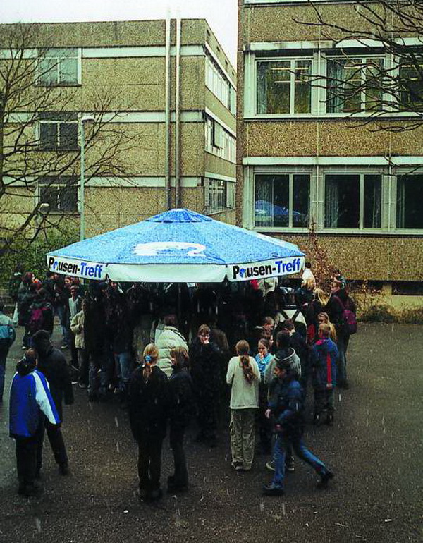 Der Pausenhofschirm / bigbrella besteht aus einem Alltetter-Schirm der mit gebrandeten Membranen auf einem Schulhof platziert wird. Der Schirm dient sowohl als Sonnen- als auch Regenschutz und ist zentral plaziert. Die längere Werbedauer und die gute und auffallende Sichtbarkeit sichert eine hohe Aufmerksamkeit bei Schülern, Lehrer und Eltern.