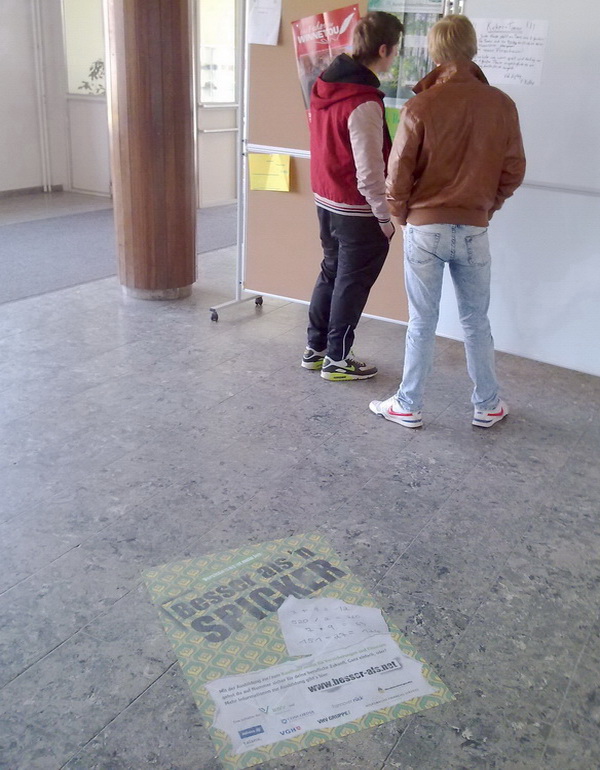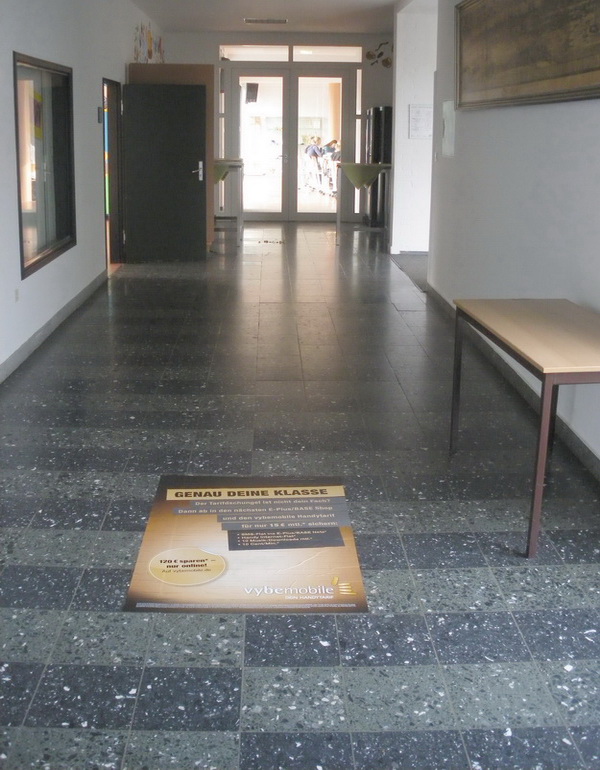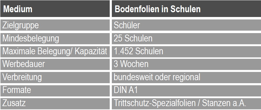 Mit speziellen Bodenfolien können Sie in Schulen Werbebotschaften verbreiten. Die Spezialfolien haben einen Trittschutz und sind rund 6 Wochen einsetzbar. Je Schule wird in der Regel 1 qm Bodenfläche im Eingangsbereich in Anspruch genommen. Dieses Medium können Sie in allen Schultypen – ausgenommen Klassenräumen (auch Außenflächen) – einsetzen. Die Motive werden noch den Kundenwünschen produziert. Die Folien werden nach dem Einsatz i.d.R. rückstandslos vom Schulboden entfernt.